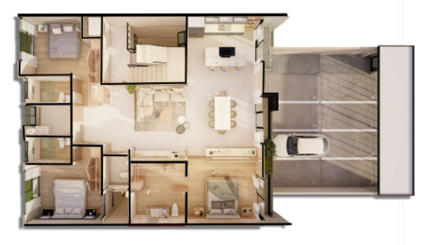 • 2 recámaras Jr. con baño c/u