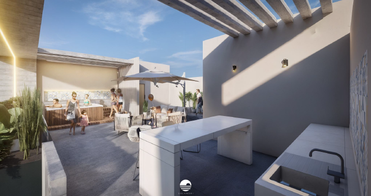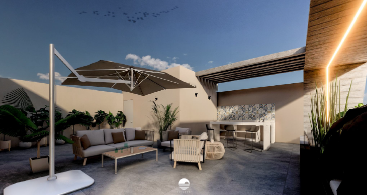 2 cajones de estacionamiento por departamento, acceso controlado, elevador y amenidades: Roof Garden con jacuzzi, barra, sala exterior y áreas de servicio.